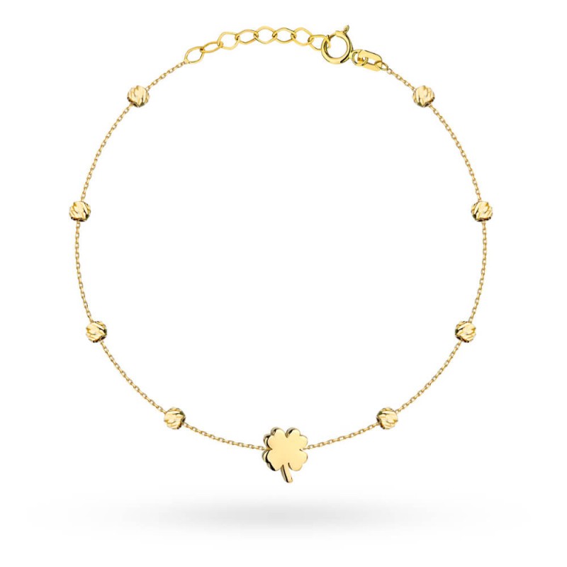 | Pełna blasku i symboliki złota bransoletka z trójwymiarową koniczynką to dodatek dla osób ceniących dobrą energię. Czterolistna koniczyna symbolizuje szczęście i pomyślność a dodatkowe diamentowe kuleczki pięknie odbijają światło, podkreślając luksusowy charakter. Stanowi idealny pomysł na prezent dla kogoś bliskiego lub jako osobisty talizman na szczęście. Wysokość koniczyny 6 mm Średnica kulki 2 mm Długość bransoletki 17 cm + 2 cm przedłużka ( do regulacji ) |