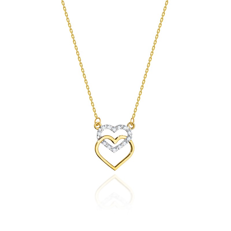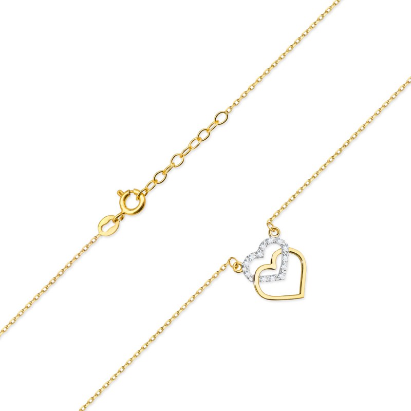 Celebrytka złota o regulowanej długości 42-45 cm przedstawiająca dwa serduszka to klasyczna biżuteria, którą będziesz cieszyć się wiele lat. Dostępna na zamówienie zarówno w żółtym, jak i białym złocie pr. 585. Łączna masa brylantów to 0.055 ct o barwie H i czystości SI. Jakość brylantów potwierdza certyfikat. Celebrytka serce to klasyczny miłosny motyw, którym możesz obdarować ukochaną osobę, by wyrazić jak bardzo ją kochasz.