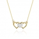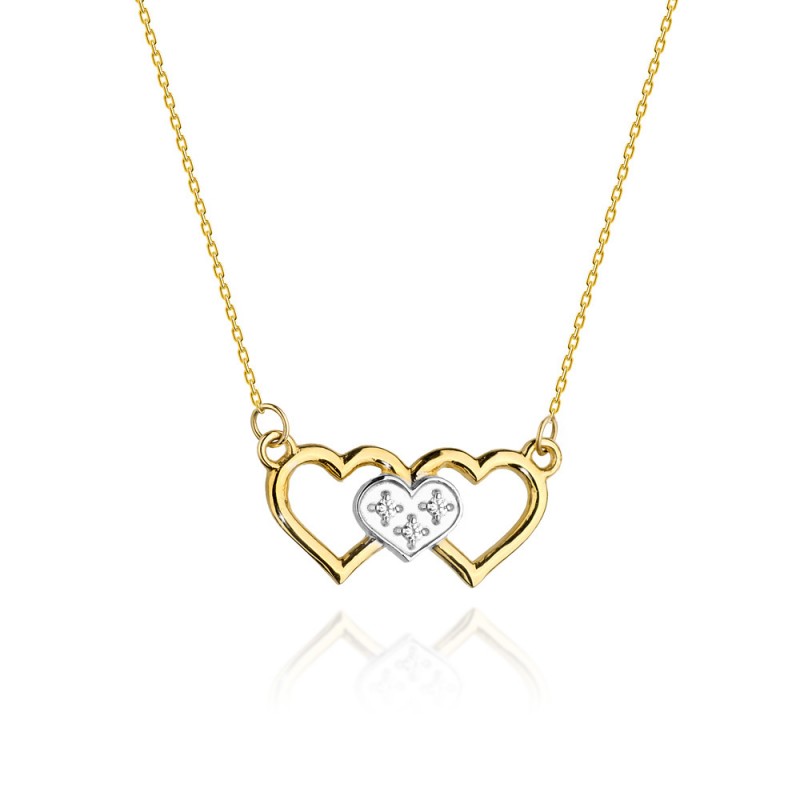 Celebrytka złota o regulowanej długości 42-45 cm przedstawiająca trzy połączone ze sobą serduszka. Środkowe wykonane jest z białego złota i ozdobione trzema brylancikami o łącznej masie 0.015 ct, barwie H i czystości SI. Naszyjnik w formie serca to ponadczasowa i klasyczna ozdoba, która będzie pasować do bardzo wielu stylizacji i nigdy się nie znudzi. Celebrytka dostępna na zamówienie zarówno w żółtym, jak i białym złocie pr. 585. Jakość brylantów potwierdza certyfikat.