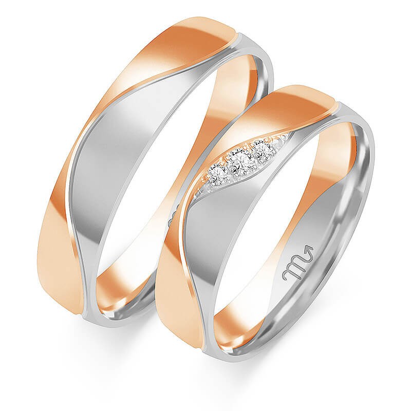 Obrączki złote o lekko wypukłym półokrągłym profilu ozdobione nacięciem w kształcie falistej linii na obwodzie. W standardzie mają szerokości 5 mm i wysokość (grubość) 1.3 mm. Można oprawić brylanty H/Si o łącznej masie 0,04 ct (1 x 0.014 + 2 x 0.008 ct) lub cyrkonie. Producent umożliwia zmianę szerokości obrączek w zakresie od 4 do 8 mm. Można zatem zamówić obrączki o różnej szerokości dla Pana i Pani. Gratisowy grawerunek nie powinien przekraczać 23 znaków. Dłuższe sentencje są możliwe lecz słabo czytelne.