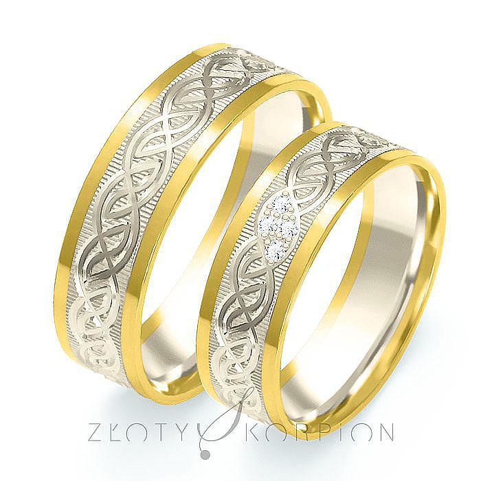 Obrączki złote o płaskim profilu, szerokości 6 mm i wysokości (grubości) 1.2 mm są wykonane z dwóch kolorów złota. W wersji z matowanym środkowym pierścieniem z białego złota i polerowanymi brzegami wyglądają bardzo korzystnie. Cztery brylanty H/Si o masie 0.009 ct każdy ozdabia obrączkę damską. Zamiast brylantów można użyć cyrkonii. Szerokość obrączek można na życzenie klienta zmienić. Gratisowy grawerunek nie powinien przekraczać 23 znaków, gdyż dłuższe napisy są słabo czytelne.