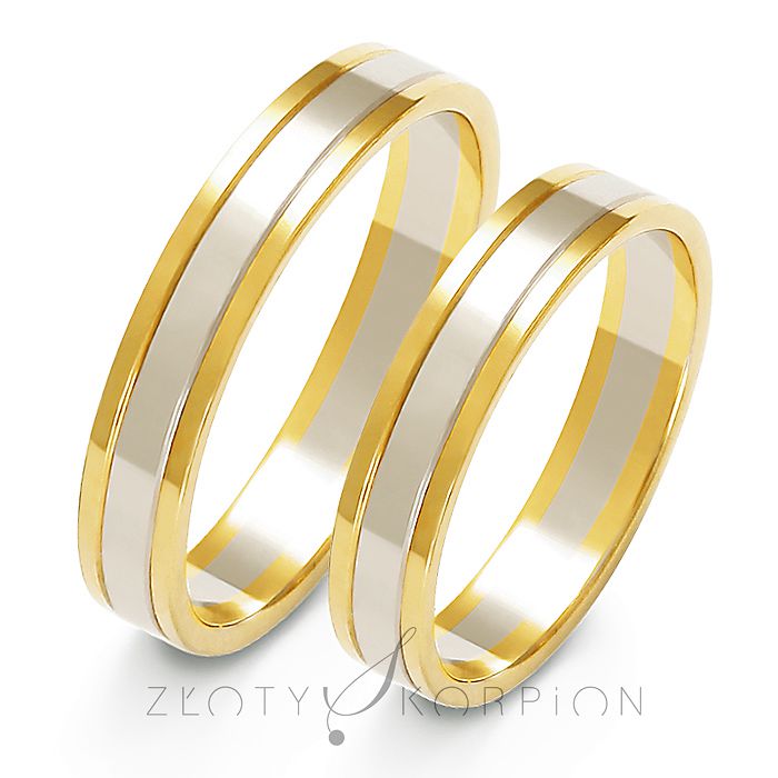Obrączki ślubne z żółtego i białego złota o płaskim profilu zewnętrznym i szerokości 4 mm - A-203