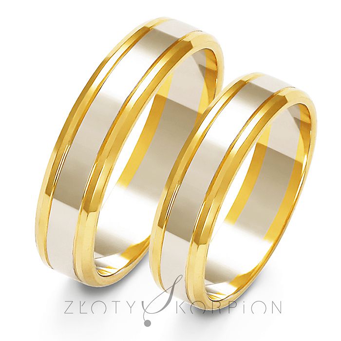 Dwukolorowe obrączki o szerokości 5 mm z białym pierścieniem centralnie na środku są najczęściej wybierane z tego rodzaju wzorów. Profil płaski z delikatnymi fazami po obu stronach jest bardzo wygodny w noszeniu. Różne kolory złota oddzielone są od siebie delikatnymi rowkami. Pierścienie z różnych kolorów złota są połączone metodą sinteringu zapewniającą nienaganną estetykę i trwałość połączenia. Dla bardziej wymagających dostępna opcja z  białym złotem palladowym. Jest to szlachetny stop białego złota nie zawierający niklu, co ma szczególne znaczenie dla alergików. Rodowanie znacznie poprawia estetykę elementów z białego złota - warto zaznaczyć tę opcję. Wyoblenie (soczewka) od wewnątrz pierścienia czyni obrączkę znacznie wygodniejszą w noszeniu. Większość naszych klientów wybiera właśnie taką wersję. Grawerunek jest bezpłatny. Raczej nie powinien przekraczać 23 znaków.