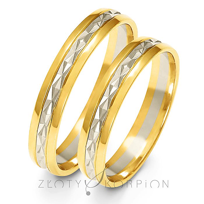 Dwukolorowe obrączki z pierścieniem z białego złota umieszczonym centralnie na środku w wyjątkowo interesującym zdobieniem. W tym modelu nie przewiduje się oprawy kamieni. Standardowa szerokość wynosi 4 mm a wysokość 1.1 mm. Wymiary te na życzenie można zmienić. Pierścienie z różnych kolorów złota oddzielone są od siebie delikatnymi rowkami. Dla bardziej wymagających klientów dostępna jest opcja połączenia żółtego złota z  białym złotem palladowym. Jest to szlachetniejszy stop białego złota nie zawierający niklu. Ma to szczególne znaczenie dla alergików. Elementy z białego złota wyglądają zdecydowanie lepiej, gdy pokryte są galwanicznie rodem - cennym śnieżno-białym metalem szlachetnym z grupy platynowców. Zalecamy wybrać opcję rodowania . Nowoczesna technologia łączenia metali metodą sinteringu zapewnia nienaganną estetykę i trwałość biżuterii wykonanej ze złota o różnych kolorach. Wyoblenie (soczewka) od wewnątrz pierścienia zdecydowanie poprawia komfort użytkowania. Obrączki z soczewką praktycznie nie czuje się na palcu. Grawerunek wykonujemy bezpłatnie. Zalecamy, aby napis nie przekraczał 23 znaków.