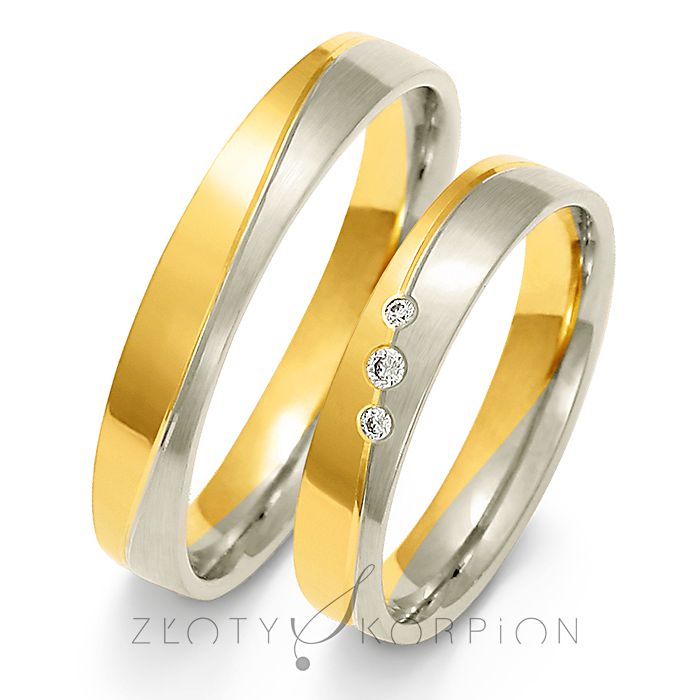 Piękne obrączki dwukolorowe, w których pierścienie są połączone wzdłuż falistej linii. Takie zestawienie kolorystyczne żółtego złota z białym wygląda bardzo korzystnie. Różne kolory złota, podobnie jak w innych modelach oddzielone są od siebie delikatnym rowkiem. Standardowa szerokość - 4 mm, wysokość (grubość) - 1.3 mm. Wymiary te na życzenie klienta można zmienić. W damskiej obrączce można oprawić trzy kamienie różnej średnicy: cyrkonie lub brylanty o łacznej masie. Dla bardziej wymagających klientów dostępna jest kompozycja żółtego złota z  białym złotem palladowym. Jest to szlachetniejszy stop białego złota nie zawierający niklu. Ma to szczególne znaczenie dla alergików. Elementy z białego złota wyglądają zdecydowanie lepiej, gdy pokryte są galwanicznie rodem - cennym śnieżno-białym metalem szlachetnym z grupy platynowców. Zalecamy wybrać opcję rodowania . Nowoczesna technologia łączenia metali metodą sinteringu zapewnia nienaganną estetykę i trwałość biżuterii wykonanej ze złota o różnych kolorach. Wyoblenie (soczewka) od wewnątrz pierścienia zdecydowanie poprawia komfort użytkowania. Obrączki z soczewką praktycznie nie czuje się na palcu. Grawerunek wykonujemy bezpłatnie. Zalecamy, aby napis nie przekraczał 23 znaków.