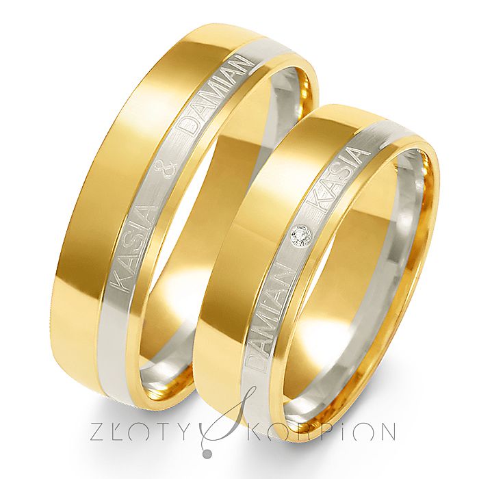 Ponadczasowe obrączki dwukolorowe o klasycznym półokrągłym kształcie mają standardowo szerokość 6 mm i wysokość 1.2 mm. Wymiary te można zmienić i wykonać tez wzór w niższej cenie. W takim zestawieniu kolorystycznym, gdzie pierścień z białego złota umieszczony jest niesymetrycznie wyglądają bardzo korzystnie. Producent proponuje umieszczenie grawerunku na zewnątrz obrączki i ozdobienie obrączki damskiej diamentem lub cyrkonią Swarovsky Sygnity. Złoto o różnych kolorach oddzielone jest delikatnym rowkiem naciętym na obwodzie. Dla bardziej wymagających klientów dostępna jest kompozycja żółtego złota z  białym złotem palladowym. Jest to szlachetniejszy stop białego złota nie zawierający niklu. Ma to szczególne znaczenie dla alergików. Elementy z białego złota wyglądają zdecydowanie lepiej, gdy pokryte są galwanicznie rodem - cennym śnieżno-białym metalem szlachetnym z grupy platynowców. Zalecamy wybrać opcję rodowania. Nowoczesna technologia łączenia metali metodą sinteringu zapewnia nienaganną estetykę i trwałość biżuterii wykonanej ze złota o różnych kolorach. Wyoblenie (soczewka) od wewnątrz pierścienia zdecydowanie poprawia komfort użytkowania. Obrączki z soczewką praktycznie nie czuje się na palcu. Grawerunek wykonujemy bezpłatnie. Zalecamy, aby napis nie przekraczał 23 znaków.