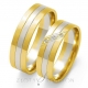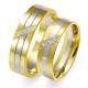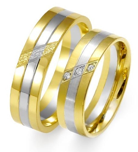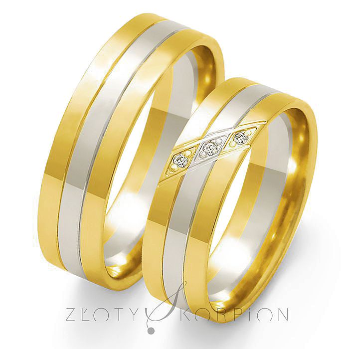 Prosty dwukolorowy model obrącze z żółtego i białego złota o szerokości 6 mm. Na uwagę zasługuje ciekawa oprawa brylantów w obrączce damskiej. Obrączki zaprezentowane są w wersji wypolerowanej.