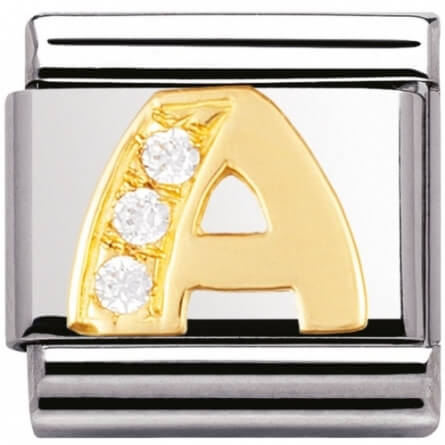 Zawieszka Nomination ze stali szlachetnej ozdobiona złotem próby 750 z literką A z cyrkoniami.