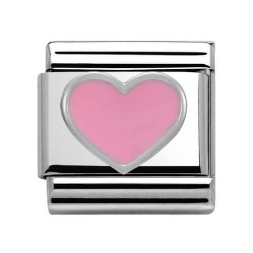 Element Nomination "Różowe serce" wykonany ze stali szlachetnej oraz srebra próby 925 ozdobionego różową emalią.