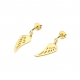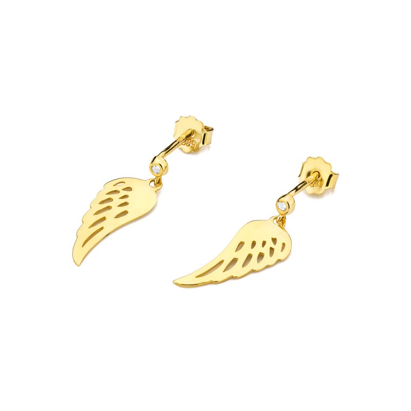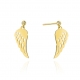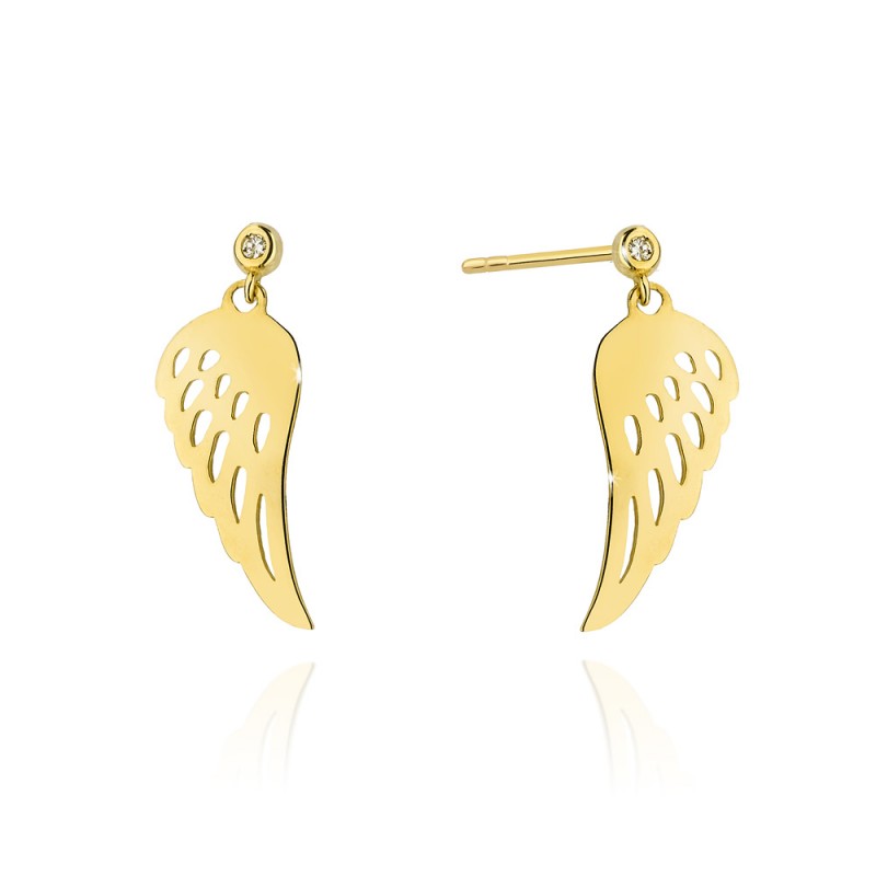 Kolczyki w kształcie skrzydeł, wykonane ze złota pr. 585, dostępne na zamówienie w żółtym i białym złocie. Wysokość około 23 mm, szerokość około 8 mm. W kolczykach oprawiono brylanty o łącznej masie 0,029 ct, czystości Si i barwie H, które tworzą piękny komplet z naszyjnikiem - celebrytką o takim samym wzorze. Kolczyki osadzone są na wygodnym sztyfcie, subtelnie opadają wzdłuż ucha, tworząc efekt lekko wiszącej formy. Ich dynamiczny kształt nadaje stylizacji wyjątkowego charakteru - idealnie zarówno na co dzień, jak i na specjalne okazje.