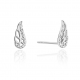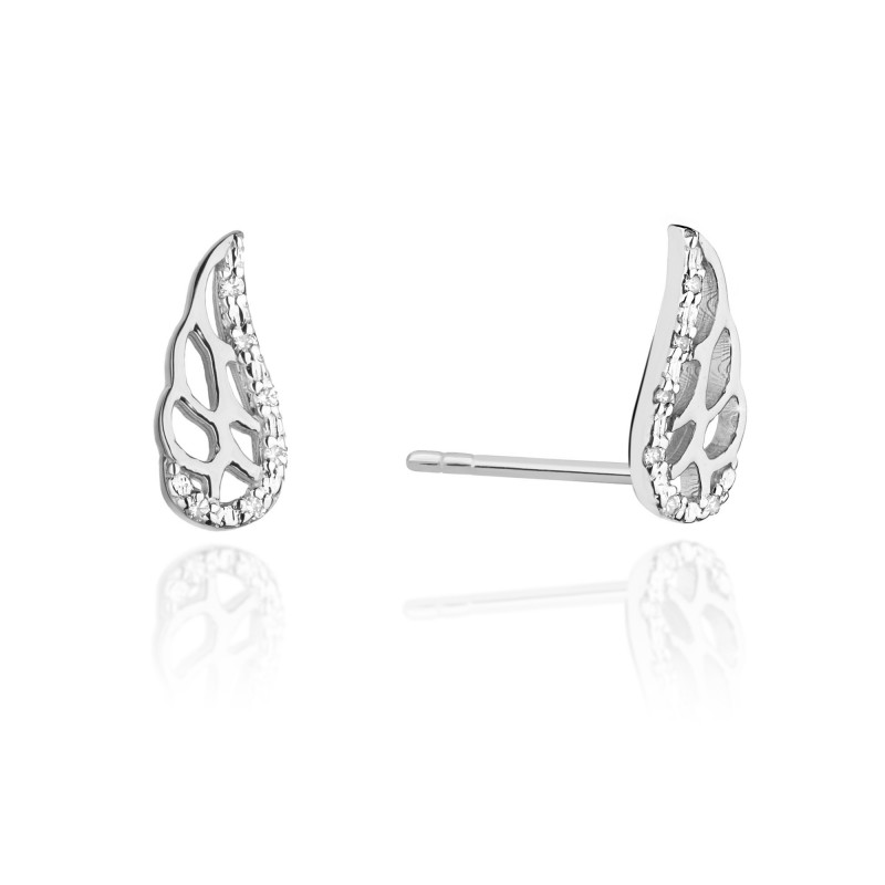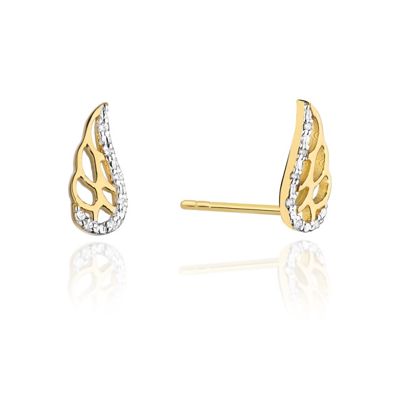 Kolczyki sztyfty w kształcie skrzydeł wykonane ze złota pr. 585, dostępne na zamówienie w żółtym i białym złocie. Wysokość 5 mm, szerokość 12 mm. W kolczykach oprawiono brylanty o łącznej masie 0.06 ct o czystości Si i barwie H, które tworzą piękny komplet z naszyjnikiem - celebrytką o takim samym wzorze.