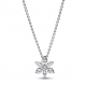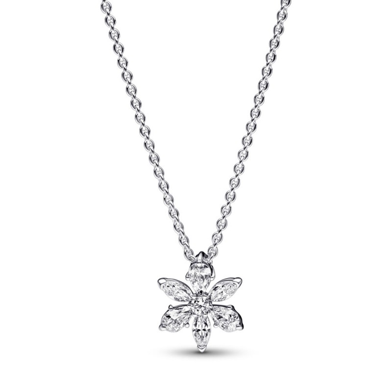 Ten srebrny naszyjnik przedstawia geometryczny kształt inspirowany płatkami kwiatów i liśćmi.