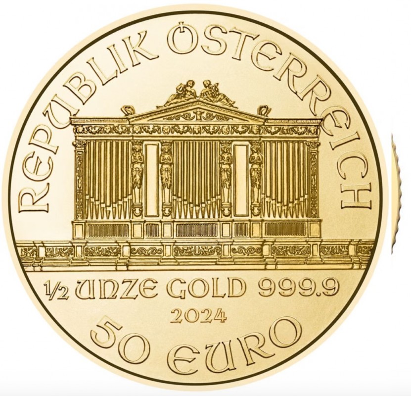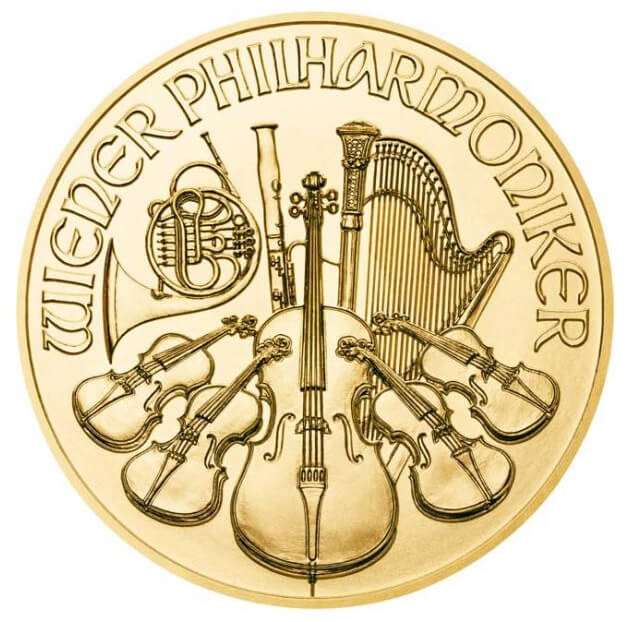 Moneta Wiedeńscy Filharmonicy jest jedyną monetą bulionową bitą w Europie. Wzór monety został opracowany w 1989 roku za pomocą grafiki komputerowej, a następnie przeniesiony na złoto. Jest jedną z monet inwestycyjnych najlepiej sprzedawaną na całym świecie. Każda z monet zawiera 15.55 g czystego złota, czyli 1/2 uncji trojańskiej. Na awersie widzimy organy hali koncertowej Musikverein w Wiedniu, gdzie swoją siedzibę ma orkiestra oraz wartość, wagę, próbę oraz rok wybicia monety. Rewers przedstawia niezwykle precyzyjnie odwzorowane instrumenty muzyczne m.in. harfę, wiolonczelę i kilka par skrzypiec.
