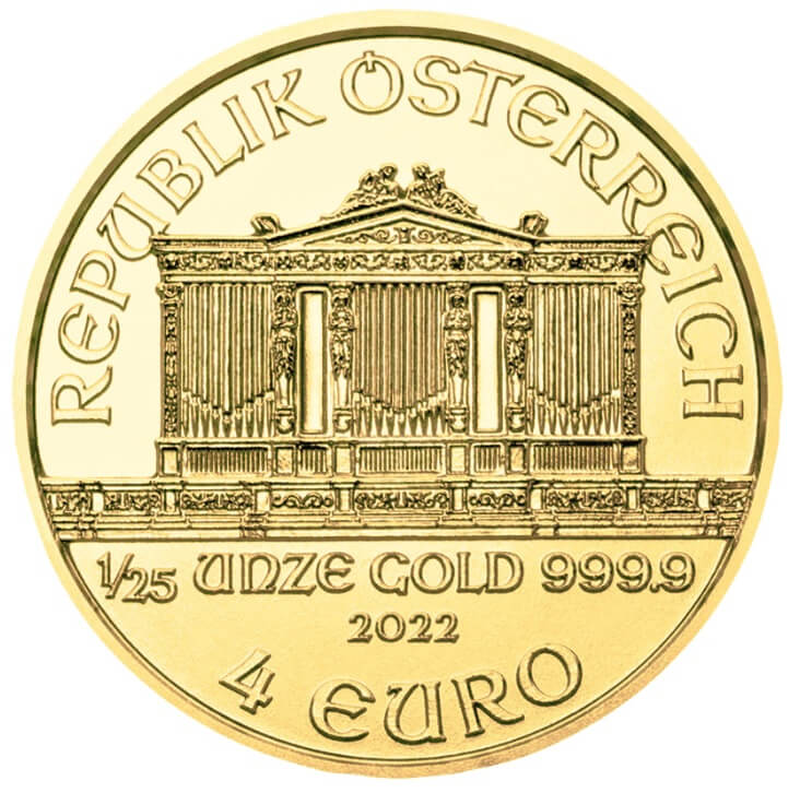 Moneta Wiedeńscy Filharmonicy jest jedyną monetą bulionową bitą w Europie. Wzór monety został opracowany w 1989 roku za pomocą grafiki komputerowej, a następnie przeniesiony na złoto. Jest jedną z monet inwestycyjnych najlepiej sprzedawaną na całym świecie. Monety są wybijane w różnych nominałach, zaprezentowana moneta waży 1/25 oz i zawiera 1.24 g czystego złota. Średnica monety: 13 mm. Na awersie widzimy organy hali koncertowej Musikverein w Wiedniu, gdzie swoją siedzibę ma orkiestra oraz wartość, wagę, próbę oraz rok wybicia monety i nominał. Rewers przedstawia niezwykle precyzyjnie odwzorowane instrumenty muzyczne m.in. harfę, wiolonczelę i kilka par skrzypiec.