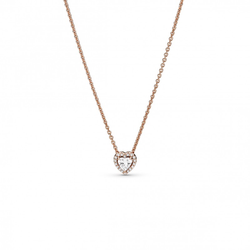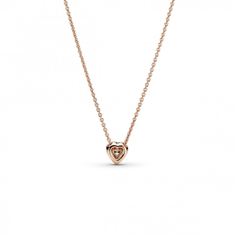 Pięknie wykończony naszyjnik został wykonany z unikalnego stopu metali, który platerowany jest 14-karatowym złotem. Kolia zachwyca wypukłym kamieniem w kształcie serca, otoczonym przezroczystymi