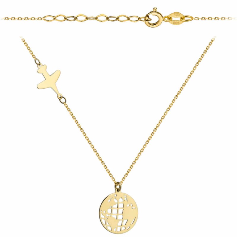Ten elegancki naszyjnik wykonany ze złota próby 585 to idealny dodatek dla odkrywców i miłośników przygód. Delikatny łańcuszek zdobi zawieszka w kształcie kuli ziemskiej oraz samolot, symbolizujące marzenia, wolność i pasję do odkrywania świata. Idealny zarówno do noszenia na co dzień, jak i jako wyjątkowy prezent dla osoby, która ma podróżniczą duszę. Długość 42 cm + 3 cm regulacja.