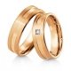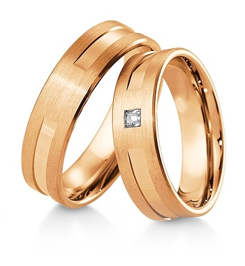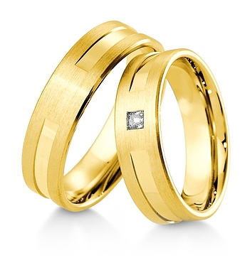 Interesujące złote obrączki ślubne z wyfrezowanym na środku szerokim rowkiem. Rowek jest polerowany a pozostała powierzchnia polerowana. W damskiej obrączce producent proponuje oprawienie wysokiej klasy brylantu o czystości IF , kolorze TW i masie 0.06 ct , Firma Breuning należy do czołowych producentów biżuterii ślubnej na Świecie a zaprezentowane wyroby można swobodnie modyfikować. Dostępne są różne wersje kolorystyczne: żółta, biała i różowa oraz różne próby złota: 333, 375, 585 i 750.