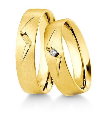 Ekskluzywne złote obrączki ślubne Breuning z ozdobnym oryginalnym nacięciem w kształcie błyskawicy. W damskiej pośrodku nacięcia można oprawić brylant 0.03 ct o barwie W i czystości SI. Obrączki prezentują się dobrze w wersji matowanej z polerowanymi nacięciami, ale można również zamówić wersję polerowaną. Szerokość obrączki w standardzie wynosi 5.5 mm, ale na życzenie można ją zmienić. Dostępne są trzy kolory złota: żółty różowy i biały oraz cztery próby złota: 333, 375, 585 i 750.