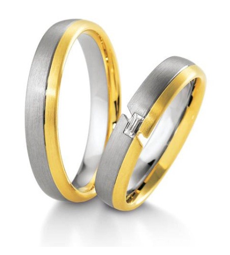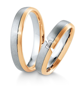 Ekskluzywne dwukolorowe obrączki ślubne Breuning wykonane z białego i żółtego złota. Damską obrączkę ozdabia doskonałej jakości brylant o szlifie prostokątnym (bagietka) o masie 0.06 ct , barwie G (TW) i najwyższej czystości IF. Obrączki prezentują się dobrze w wersji matowanej, ale można również zamówić wersję polerowaną. Szerokość obrączki wynosi 4.5 mm. Dostępne są różne wersje kolorystyczne i aż cztery próby złota: 333, 375, 585 i 750.