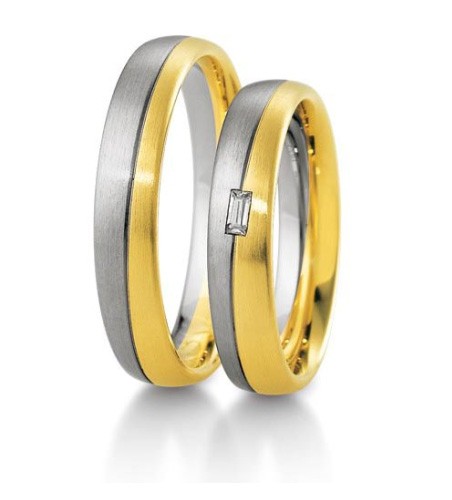 Ekskluzywne ponadczasowe dwukolorowe obrączki ślubne Breuning wykonane z z dwóch pierścieni z białego i żółtego złota połączonych wzdłuż skośnej linii. Damską obrączkę zdobi doskonałej jakości brylant o szlifie prostokątnym (bagietka) o masie 0.06 ct , barwie G (TW) i najwyższej czystości IF. Obrączki prezentują się doskonale zarówno w wersji matowanej jak polerowanej. Szerokość obrączki wynosi 4.5 mm. Dostępne są różne wersje kolorystyczne i aż cztery próby złota: 333, 375, 585 i 750.