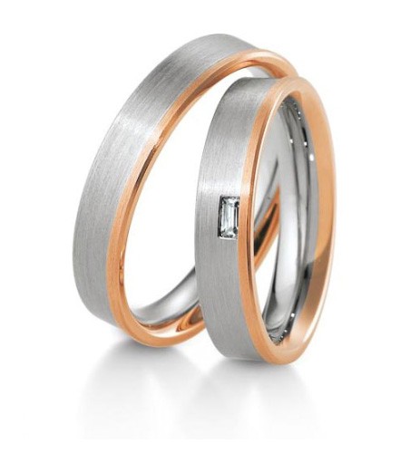 Prosty, klasyczny model dwukolorowych obrączek Breuning z kolekcji INSPIRATION wykonanych z białego złota z pierścieniem ze złota różowego lub żółtego przy jednej krawędzi. Obrączkę damską zdobi najwyższej jakości brylant o czystości IF , barwie G (TW) i masie 0.06 ct. Szerokość 4.5 mm jest optymalna dla tego wzoru, ale możemy zlecić wykonanie wersji o większej szerokości. Biżuteria Breuning może być wykonana ze złota różnych prób: 333, 375, 585 i 750, w związku z czym ten sam model jest dostępny w zróżnicowanych cenach.