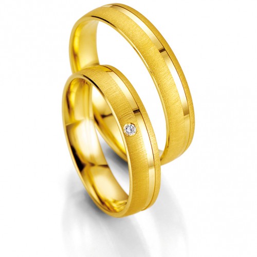 Ekskluzywne obrączki ślubne Breuning z kolekcji SmartLine wzór 7003 wykonane w technologii bezszwowej z żółtego złota. W wersji standardowej producent proponuje powierzchnię matowaną z polerowanym rowkiem z oprawą pojedynczego brylantu o barwie H i czystości Si w obrączce damskiej. Na życzenie obrączki można wypolerować w całości, ilość diamentów można również zwiększyć lub z ich oprawy zrezygnować. Jest również możliwość zmiany szerokości i wysokości przekroju. W przypadku chęci modyfikacji wzoru kliknij link "Zapytaj o produkt". Dokonamy wówczas indywidualnej wyceny.