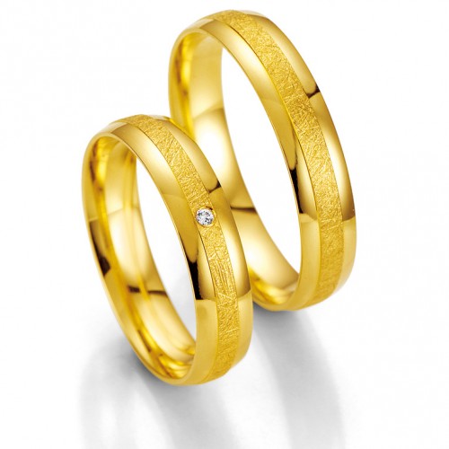 Obrączki z kolekcji SmartLine 7013 firmy Breuning wykonane z żółtego złota w technologii bezszwowej. Środkowy pasek jest matowany z użyciem bardzo oryginalnego sposobu matowania. Po bokach obrączka jest polerowana. W modelu damskim oprawiono brylant H/S o masie 0.010 ct.