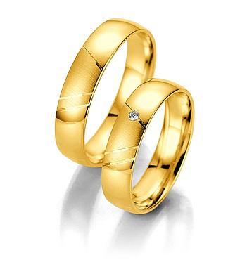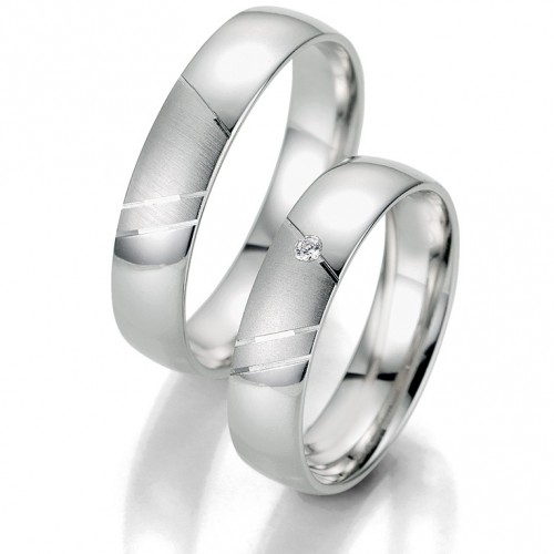 Obrączki Breuning z kolekcji Smart Line - wzór 7039 szerokości 5 mm. Część polerowana od matowanej oddzielona jest delikatnymi nacięciami. W jednym z rowków oprawiony jest brylant o masie 0.015 ct H/SI. Doskonałą jakość wyrobu gwarantuje technologia bezszwowa.