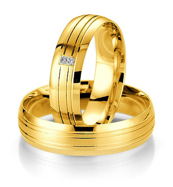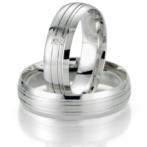Obrączki Breuning z kolekcji Smart Line - wzór 7043 szerokości 5.5 mm. Część polerowana od matowanej oddzielona jest delikatnymi wytoczonymi na obwodzie rowkami. W modelu damskim producent proponuje niesymetryczne oprawienie dwóch brylantów o łącznej masie 0.020 ct H/SI. Doskonałą jakość wyrobu gwarantuje technologia bezszwowa.