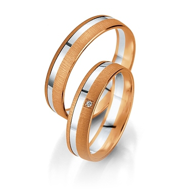 Obrączki z kolekcji SmartLine wzór 7051 firmy Breuning z dwóch kolorów złota o szerokości 5 mm. W standardzie powierzchnia z kolorowego złota jest matowana a wewnętrzny pierścień z białego złota - polerowany. Producent proponuje oprawę brylantu w pierścieniu wykonanym z żółtego lub różowego złota. Obrączki zostały wyprodukowane w oparciu o technologię bezszwową.
