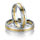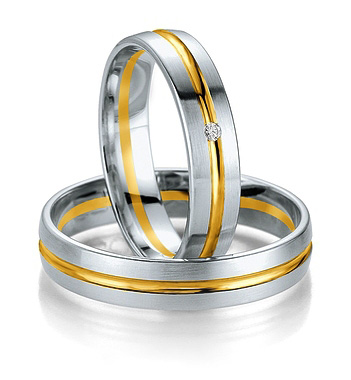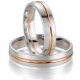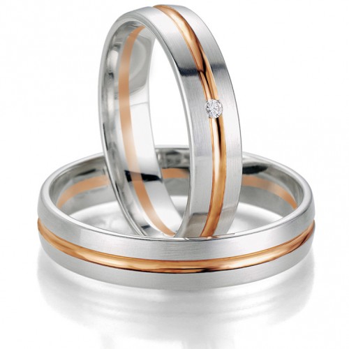 Dwukolorowe obrączki o szerokości 4.5 mm z kolekcji Smart Line firmy Breuning wzór 7053. Najkorzystniej wyglądają w wersji przedstawionej na zdjęciu z matowaną powierzchnią i polerowanym rowkiem z różowego lub żółtego złota wytoczonym centralnie na środku. W damskiej obrączce w tym właśnie rowku można oprawić jeden lub kilka brylantów o masie 0.015 ct każdy. Producent używa do wytwarzania swoich wyrobów nowoczesnej technologii bezszwowej.