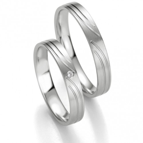 Obrączki z białego złota o szerokości 3.5 mm z kolekcji Smart Line firmy Breuning wzór 7123 wykonane w technologii bezszwowej. Bardzo delikatny i oryginalny model, w którym powierzchnia jest matowana. W obrączce damskiej producent proponuje ciekawą oprawę brylantu o masie 0.01 ct barwie H i czystości SI. Można oprawić większą ilość brylantów.