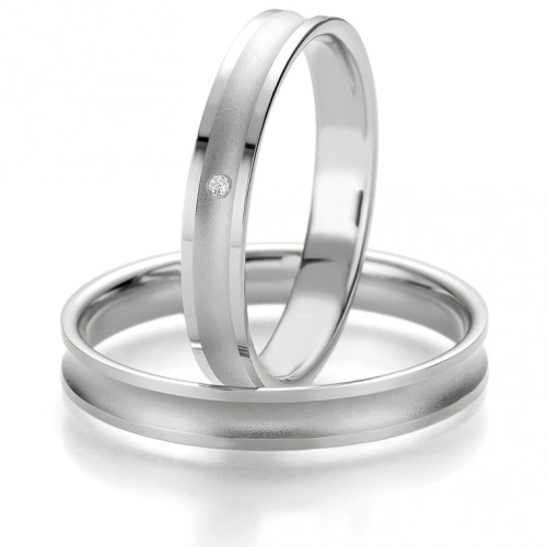 Obrączki z białego złota o szerokości 3.5 mm z kolekcji Smart Line firmy Breuning wzór 7125 wykonane w technologii bezszwowej. Bardzo delikatny i oryginalny model, w którym powierzchnia środkowego pierścienia jest matowana, a krawędzie wykonane są z polerowanego złota. W obrączce damskiej producent proponuje ciekawą oprawę brylantu o masie 0.007 ct barwie H i czystości SI. Można oprawić większą ilość brylantów.