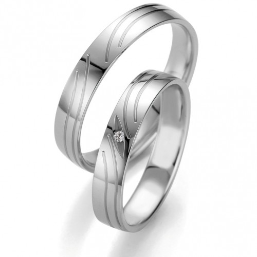 Obrączki z białego złota o szerokości 4 mm z kolekcji Smart Line firmy Breuning wzór 7133 wykonane w technologii bezszwowej. Bardzo delikatny i oryginalny model, w którym powierzchnia z białego złota jest matowana a wzór z polerowanego złota. W obrączce damskiej producent proponuje oprawę brylantu o masie 0.01 ct barwie H i czystości SI. Można oprawić większą ilość brylantów.