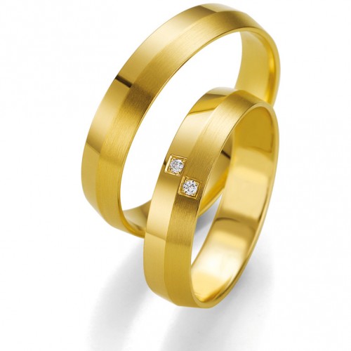 Obrączki z żółtego złota o szerokości 4.5 mm z kolekcji Smart Line firmy Breuning wzór 7137 wykonane w technologii bezszwowej. Bardzo interesujący i oryginalny model, w którym powierzchnia jest w połowie matowana a połowie polerowana. W obrączce damskiej producent proponuje oprawę dwóch brylantów o łącznej masie 0.02 ct barwie H i czystości SI. Można oprawić większą ilość brylantów.