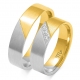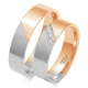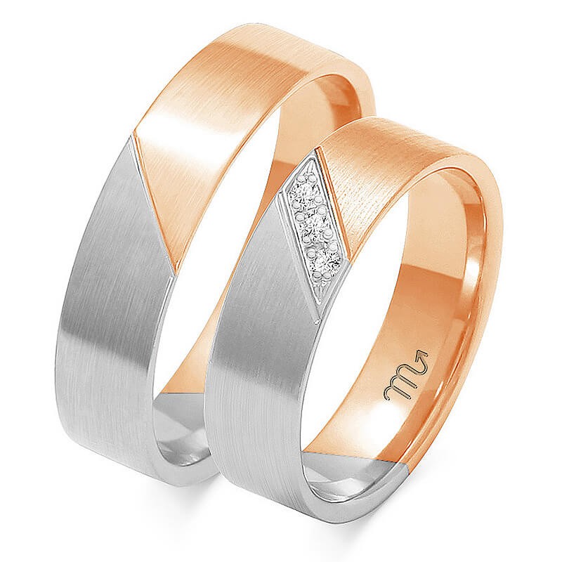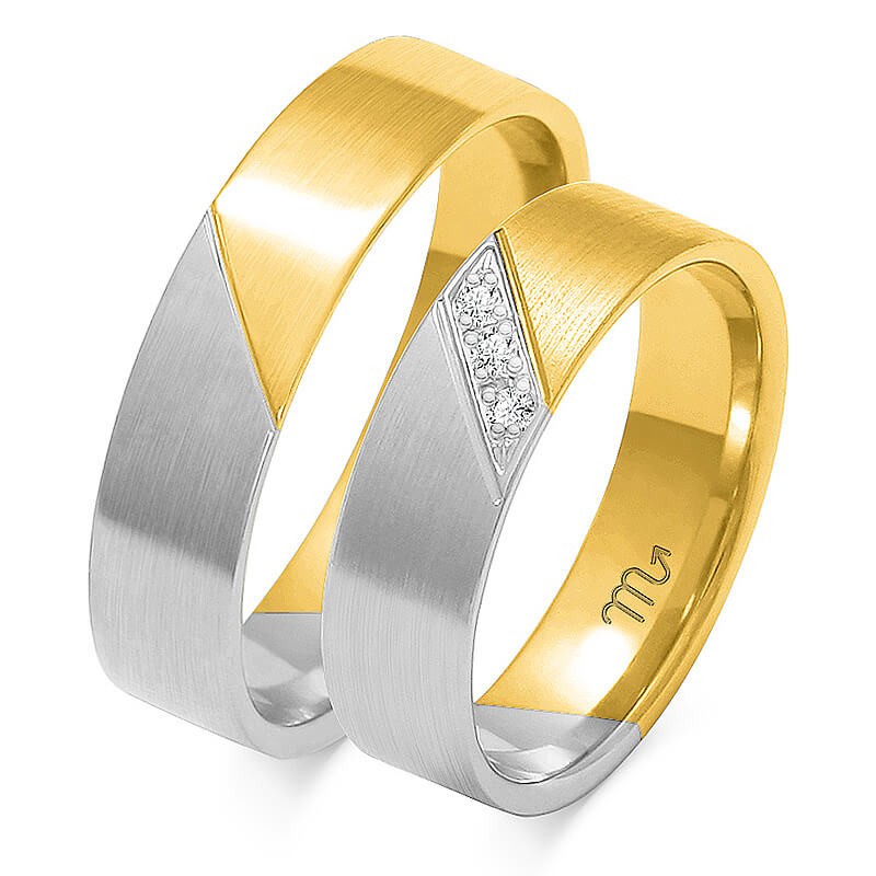 Ekskluzywne dwukolorowe obrączki z ciekawą oprawą kamieni w obrączce damskiej. Obrączki wykonane są w połowie z białego a w drugiej połowie z żółtego lub różowego złota. Zaprezentowana wersja posiada powierzchnię wypolerowaną, ale nic nie stoi na przeszkodzie, aby zamówić ten model w wersji matowej. Damska obrączka może być ozdobiona cyrkoniami lub brylantami.