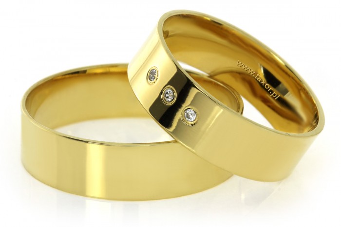 Klasyczne złote obrączki Zirkon o płaskim profilu zewnętrznym i szerokości 6 mm.