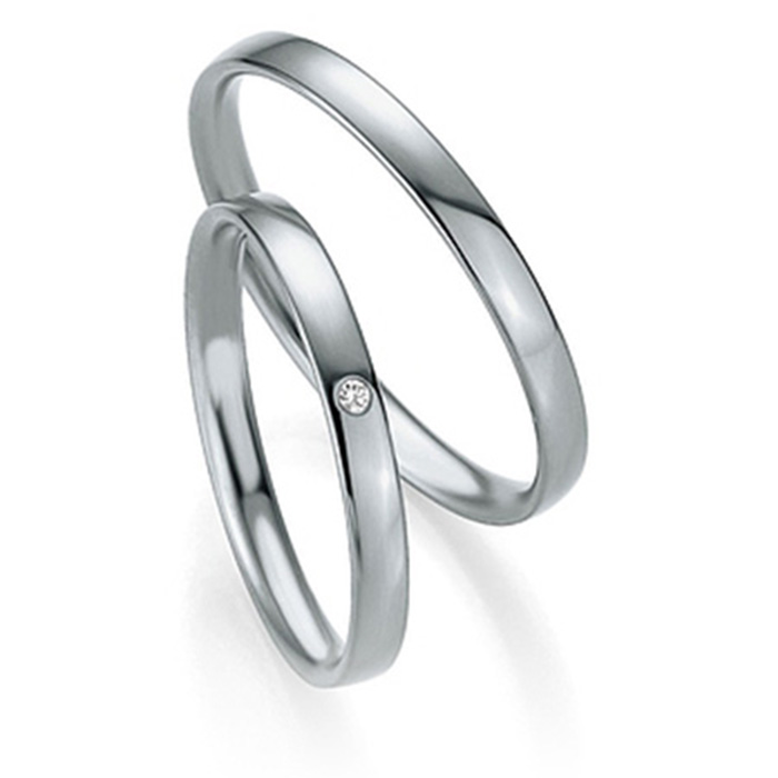 Obrączki platynowe wzór 4301 o szerokości 2 mm z kolekcji Basic Slim firmy Breuning wykonane w technologii bezszwowej. W wersji standardowej model damski ozdobiony jest drobnym brylantem o masie 0.006 ct o czystości SI i barwie H.