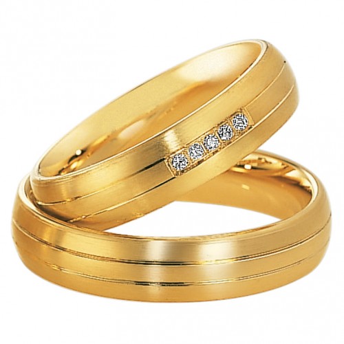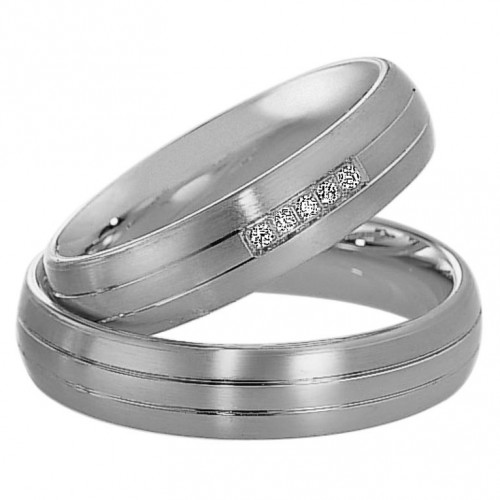 Jednokolorowe obrączki SAINT MAURICE z kolekcji ETERNITY model 82010, 82011 wykonane w technologii bezszwowej. Klasyczny wzór obrączek ślubnych z delikatnymi dwoma rowkami naciętymi na całym obwodzie. W damskiej obrączce oprawiono 5 brylantów.