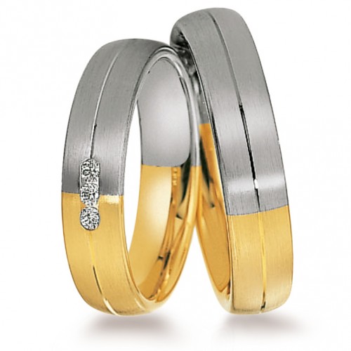 Dwukolorowe obrączki SAINT MAURICE z kolekcji ETERNITY model 82024, 82025 wykonane w technologii bezszwowej. Klasyczne dwukolorowe obrączki ślubne ozdobione na środku delikatnym rowkiem. Zaprezentowany na zdjęciu model jest matowy, ale można go również wykonać w wersji polerowanej. W damskiej obrączce oprawione są brylanty o łącznej masie 0.075 ct.