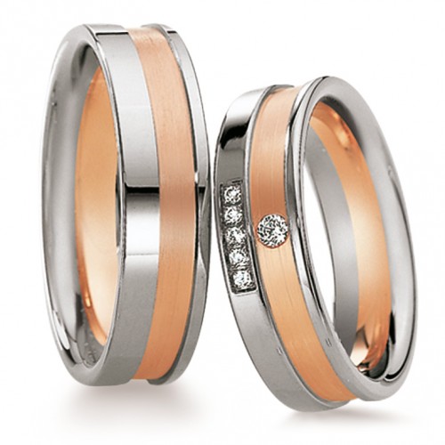Dwukolorowe obrączki SAINT MAURICE z kolekcji ETERNITY model 82030, 82031 wykonane w technologii bezszwowej. Oryginalne obrączki ślubne o wklęsłej powierzchni zewnętrznej. Zaprezentowany na zdjęciu model jest matowy, ale można go również wykonać w wersji polerowanej. W damskiej obrączce oprawione są brylanty o łącznej masie 0.072 ct.