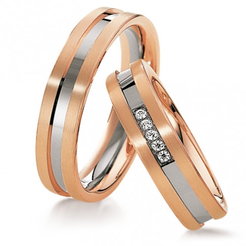 Obrączki złote SAINT MAURICE z kolekcji ETERNITY model 82032, 82033 wykonane w technologii bezszwowej. Ciekawe dwukolorowe obrączki ślubne z rowkiem z białego złota na środku. W obrączce damskiej oprawiono 5 szt brylantów o masie łącznej 0,05 ct.