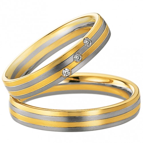 Złote obrączki z brylantami SAINT MAURICE z kolekcji ETERNITY model 82042, 82043 wykonane w technologii bezszwowej.  Dwukolorowe obrączki z żółtego i z białego złota o klasycznym lekko półokrągłym kształcie. Na zdjęciu zaprezentowano ten model w wersji matowej, ale wygląda również interesująco w wersji polerowanej. W obrączce damskiej oprawiono 3 brylanty łącznej masie 0,045 ct.