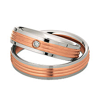 Złote obrączki z brylantami SAINT MAURICE z kolekcji ETERNITY model 82070 wykonane w technologii bezszwowej. Obrączki dwukolorowe wykonane z dwóch pierścieni z różnych kolorów złota o szerokości 5 mm ozdobione delikatnymi rowkami. Obrączka damska ozdobiona jest brylantem W/SI masie 0,035 ct.