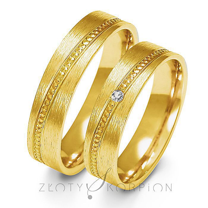 Obrączki ślubne o szerokości 5 mm i wysokości profilu 1.3 mm o płaskim profilu są bardzo popularne. Dodatkowe zdobienie na obwodzie dodaje im szczególnego uroku. Dla pań producent proponuje oprawę kamienia - cyrkonii lub brylantu. Wykonywane są najczęściej ze złota próby 585, ale jest możliwość zamówienia tańszej wersji w próbie 333 (8 karat). Technologia bezszwowa gwarantuje najwyższe parametry jakościowe a soczewkowy kształt profilu wewnętrznego zapewnia niezwykłą wygodę noszenia. Takiej obrączki praktycznie nie czuć na palcu. Na zdjęciu prezentujemy ten wzór z żółtego złota, ale wykonany z różowego lub białego złota prezentuje się równie pięknie. Obrączki można obejrzeć i przymierzyć w naszych salonach jubilerskich. pełna oferta jest dostępna w Żywcu przy ul. Kościuszki 20. Serdecznie zapraszamy!