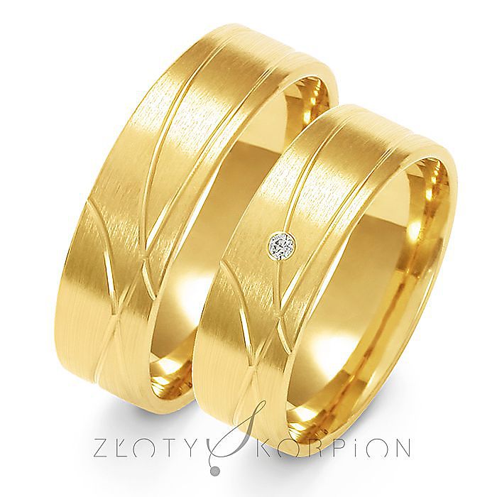 Obrączki ślubne o płaskim profilu zewnętrznym z efektownym zdobieniem. W modelu damskim piękna oprawa kamieni. Biżuteria wykonywana jest najczęściej ze złota próby 585, ale jest możliwość zamówienia tańszej wersji w próbie 333 (8 karat). Technologia bezszwowa gwarantuje najwyższe parametry jakościowe a soczewkowy kształt profilu wewnętrznego zapewnia niezwykłą wygodę noszenia. Takiej obrączki praktycznie nie czuć na palcu. Na zdjęciu prezentujemy ten wzór z żółtego złota, ale wykonany z różowego lub białego złota prezentuje się równie pięknie. Obrączki można obejrzeć i przymierzyć w naszych salonach jubilerskich.