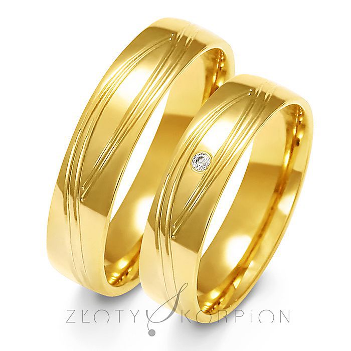 Obrączki ślubne półokrągłe z efektownym zdobieniem w postaci naciętych na powierzchni rowków. W modelu damskim producent proponuje oprawę cyrkonii lub brylantu. Biżuteria wykonywana jest najczęściej ze złota próby 585, ale jest możliwość zamówienia tańszej wersji w próbie 333 (8 karat). Technologia bezszwowa gwarantuje najwyższe parametry jakościowe a soczewkowy kształt profilu wewnętrznego zapewnia niezwykłą wygodę noszenia. Takiej obrączki praktycznie nie czuć na palcu. Na zdjęciu prezentujemy ten wzór z żółtego złota, ale wykonany z różowego lub białego złota prezentuje się równie pięknie. Obrączki można obejrzeć i przymierzyć w naszych salonach jubilerskich.