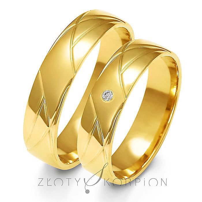 Obrączki ślubne półokrągłe z efektownym zdobieniem w postaci naciętych na powierzchni rowków. W modelu damskim producent proponuje oprawę cyrkonii lub brylantu. Biżuteria wykonywana jest najczęściej ze złota próby 585, ale jest możliwość zamówienia tańszej wersji w próbie 333 (8 karat). Technologia bezszwowa gwarantuje najwyższe parametry jakościowe a soczewkowy kształt profilu wewnętrznego zapewnia niezwykłą wygodę noszenia. Takiej obrączki praktycznie nie czuć na palcu. Na zdjęciu prezentujemy ten wzór z żółtego złota, ale wykonany z różowego lub białego złota prezentuje się równie pięknie. Obrączki można obejrzeć i przymierzyć w naszych salonach jubilerskich.
