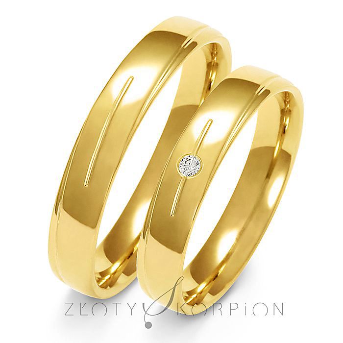 Obrączki o ponadczasowym prostym kształcie wykonane z żółtego lub różowego złota cieszą się dużym powodzeniem. W modelu damskim producent proponuje oprawę cyrkonii Swarovsky Sygnity lub brylantu o barwie H i czystości SI i średnicy 1.75 mm. Wyoblenie (soczewka) od wewnątrz pierścienia czyni obrączkę znacznie wygodniejszą w noszeniu. Większość naszych klientów wybiera tę opcję. Grawerunek jest bezpłatny. Ze względu na czytelność raczej nie powinien przekraczać 23 znaków.