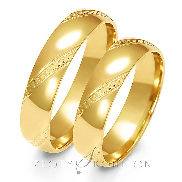 Obrączki z żółtego złota o klasycznym półokrągłym kształcie ozdobione delikatnym wzorkiem - wzór A-158